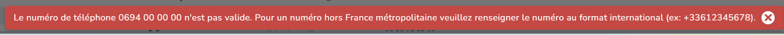 ⚠️ Pour les numéros de téléphone des DOM-TOM, le préfixe de la provenance doit être respecté sinon ce message d'erreur apparaîtra à la validation :