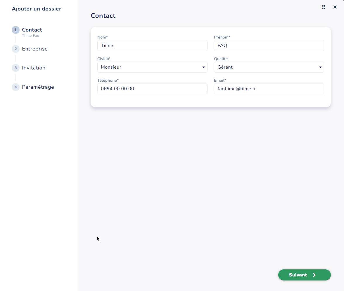 Dans le cadre d'une société déjà existante, commencez par renseigner les informations relatives au contact du dossier.