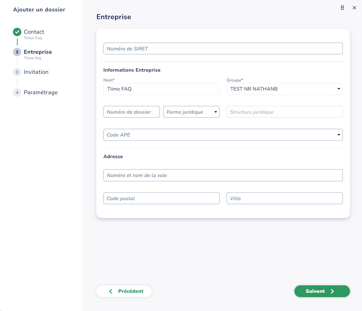 L'invitation du contact sera possible après la création du dossier depuis la page Fiche client > Associés & Dirig.