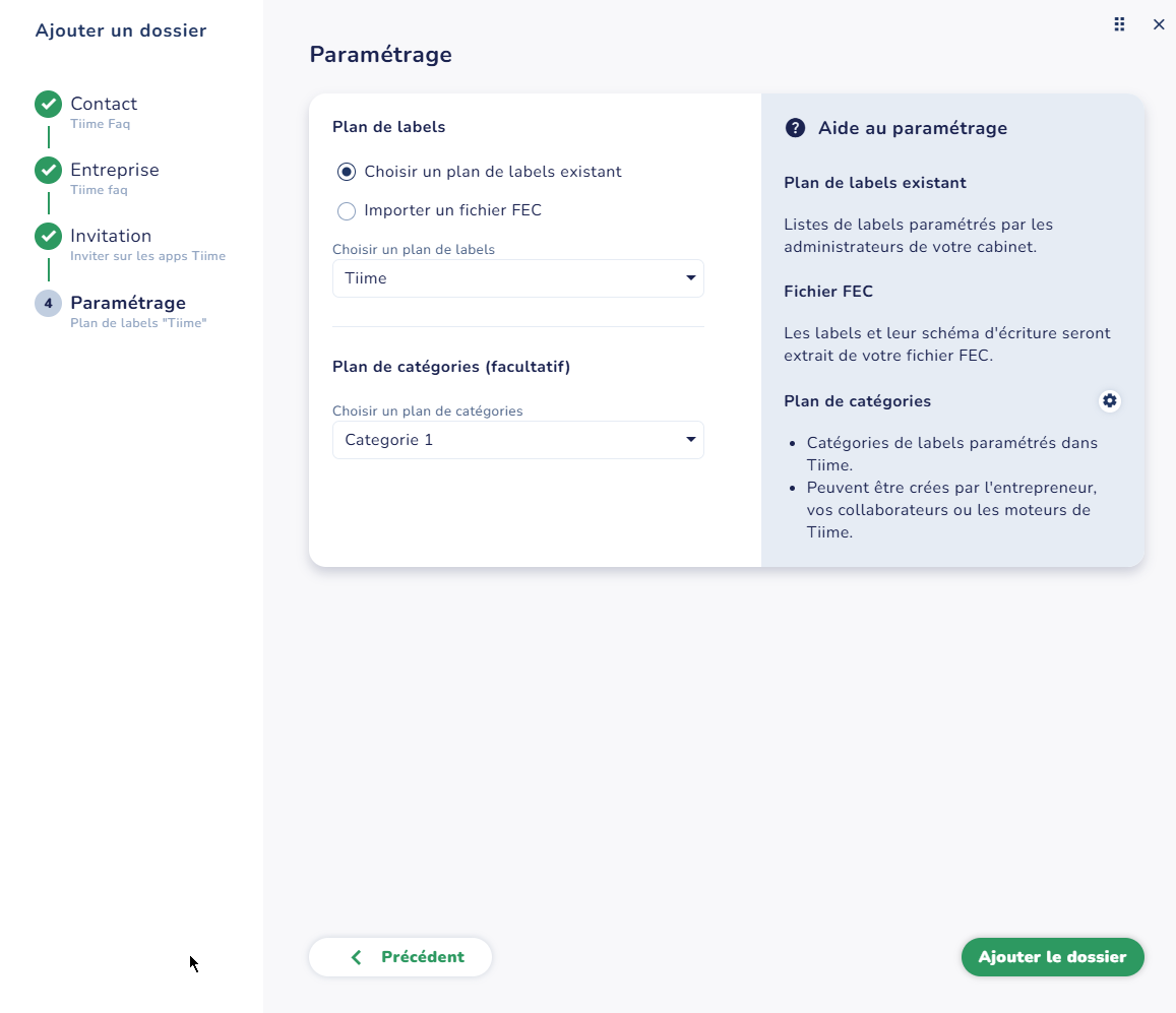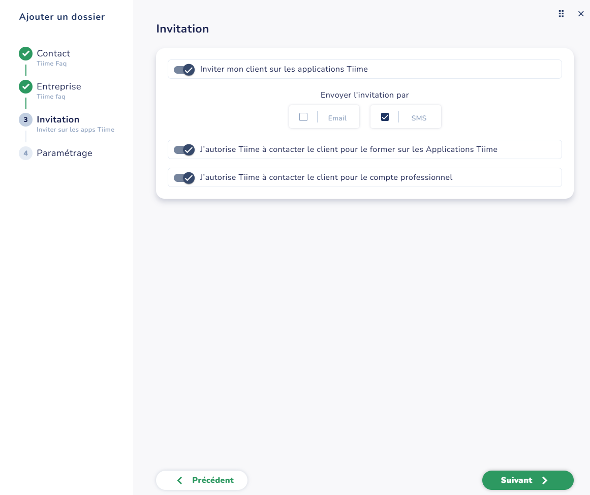 L’invitation du contact n’est pas obligatoire lors de la création du dossier, vous pouvez désactiver l’invitation en désactivant l’option “Inviter mon client sur les applications Tiime”.
