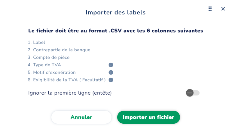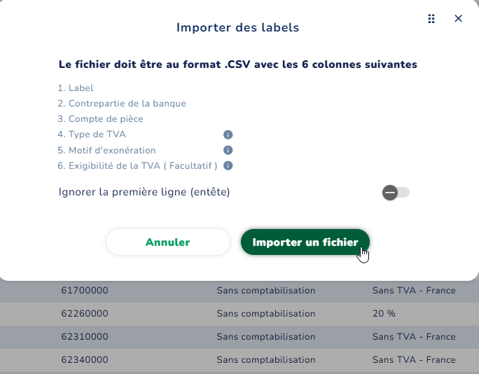 Depuis l’onglet Production Comptable > Pré comptabilité > Labels, il est possible d’importer des labels.