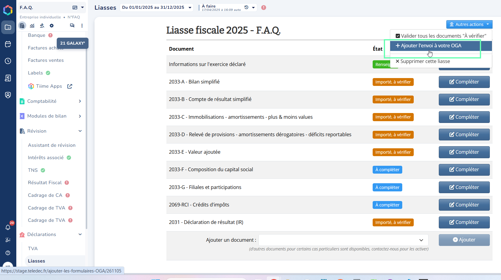 Depuis l’onglet Production comptable > Déclarations > Liasses, il est possible d’ajouter les CERFA relatifs aux OGA.
