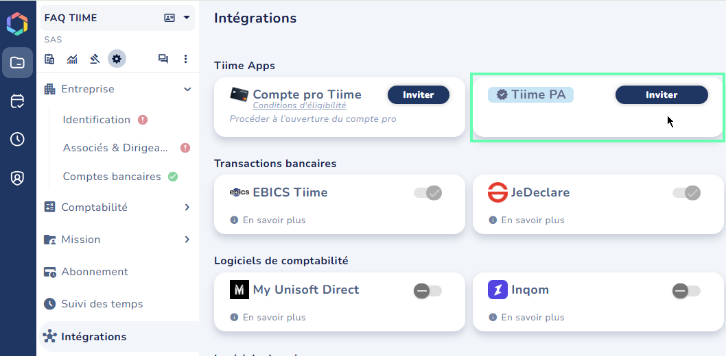 Depuis votre dossier, vous avez la possibilité d'inviter un client à utiliser notre PA. Pour cela, il faudra vous rendre dans l'onglet Paramètres > Intégrations afin de cliquer sur le bouton "Inviter".