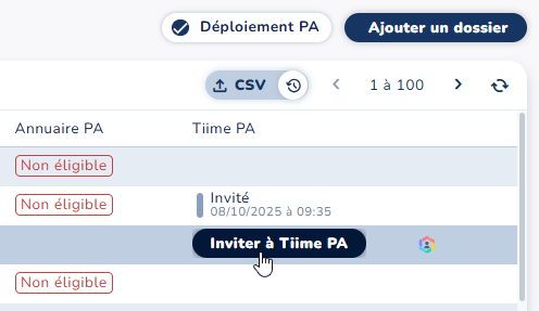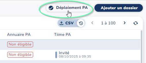 Depuis la liste des dossiers sur Tiime Expert, il est possible de suivre l'avancée de la connexion à l'annuaire PA de vos dossiers.