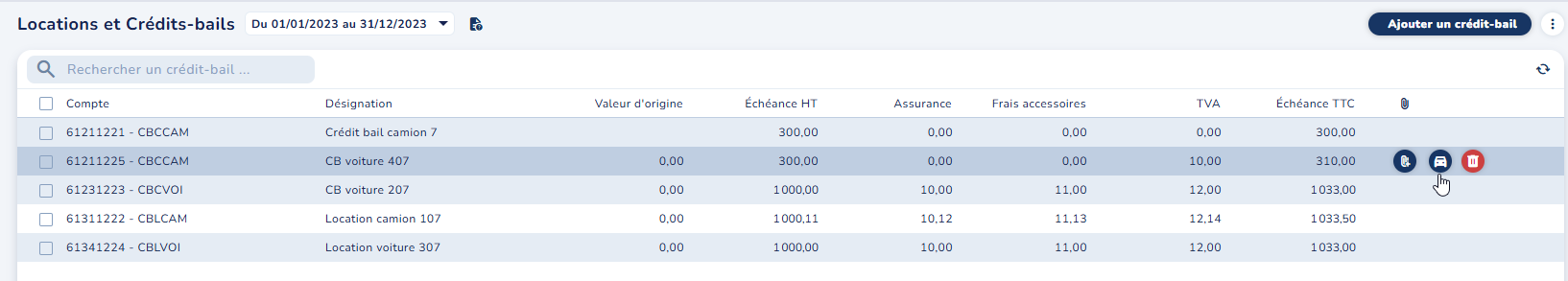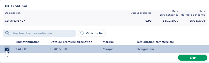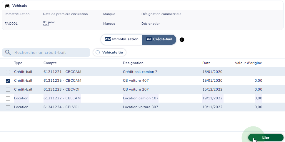 Il est possible de lier un véhicule présent dans la liste à une immobilisation et/ou un crédit-bail.