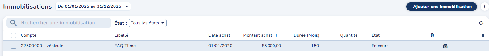 Les véhicules créés dans le module Crédit-bail ou dans le module Immobilisations et rattachés à une ligne dans ces modules sont automatiquement repris dans la page TAVT.