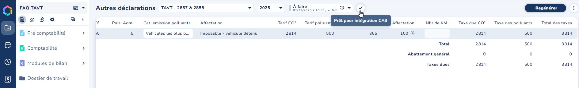 Une fois la vérification effectuée sur la page TAVT, vous pouvez valider la déclaration. Le statut passera en "Prêt pour intégration CA3 :