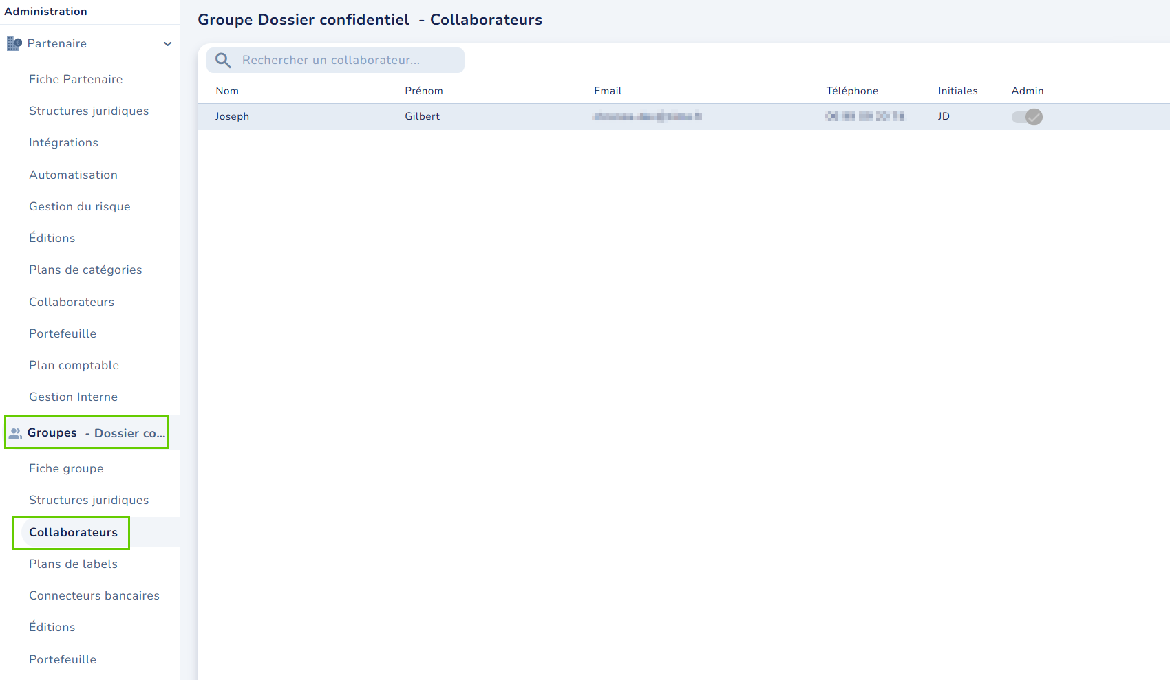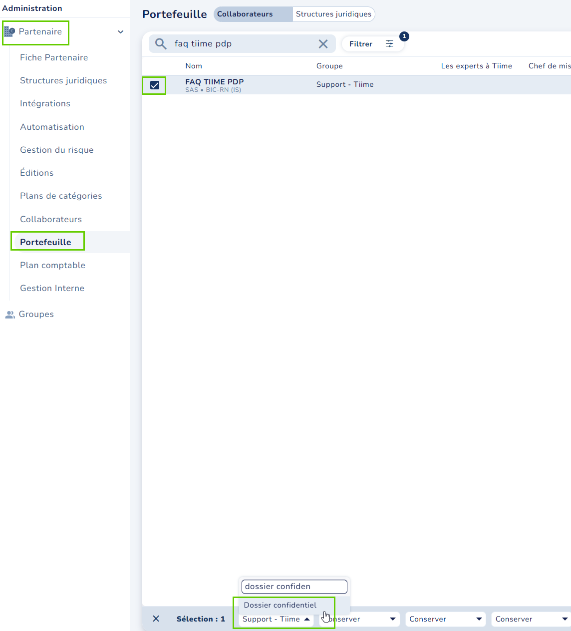 Depuis l'onglet Administration > Partenaire > Portefeuille, vous pourrez sélectionner des dossiers et les transférer dans votre groupe confidentiel.